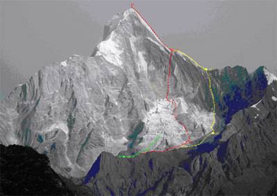 (二)幺峰南壁直上转东南山脊路线:此路线从南壁巨大的冰川冰雪槽直上,在5800米肩部登上山脊,沿东南山脊登顶,这张照片(下图)是长时间未降雪之后的全景,绿线是我们本次的攀登路线,红线是南壁直上转东南山脊路线,黄线是04年曾山他们的路线。(参见关门时限)