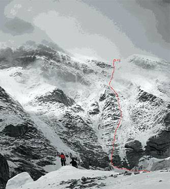 3、从5200米左右的C1出发,从艰难积雪槽直上,切上南壁,接下来是一段垂直高度为500米的冰雪岩石混和地形,坡度为50-60度,具体的情况视降雪情况而定,滚石和流雪将是最大的问题。翻上末端的冰雪檐,即抵达5800米的肩部,这里即是C2。