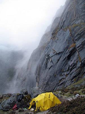 早上起来,依然是大雾,雾起雾落,风云变幻,还下着小雨。大家情绪异常低落,萌生退意,昨天看到前往04年路线根部的冰川上裂缝密布,在这样的能见度极低的天气继续攀登,无疑是危险的,而且看情况,明后天天气状况也不容乐观。但是,上还是不上?仍然是个棘手的问题。