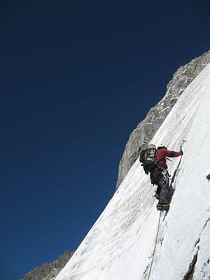路线整体较长,技术操作多,如果双人结组的话,容易通过一些困难的地形,如冰川裂缝区,山脊蘑菇状区域等。但是在攀登时需要良好的适应和体能,而且需要非常熟练的技术操作,大部分地区应该采用Running Belay的方法,才有可能实现安全、快速的攀登。