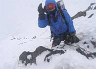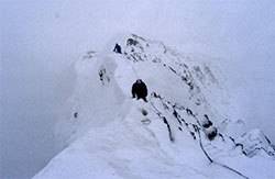 本来我要爬那个较低的岩壁的,后来你劝我不要爬往左侧绕过去,虽然都是很陡的,但我主要是害怕左侧下面是无底的悬崖,所以当时上镐在直壁上的时候,一发力,当即就把一块巨大的岩石钩挂下来了,还好我脚先落入了雪中,那块石头被雪垫住了,没有砸到我的脚,没受伤,所以还是选择了左侧绕,也是翻上岩壁,从两块巨石中间钻了过去,发现你们所处位置的直壁真的很吓人,往下往右都是危险的悬空状态,往上在云雾中没有感觉很害怕,当时时间已近两点了,天气已经很不好了,风有点大,云很厚了,已看不到下面的1号营地了,翻上去后以为是平坦的雪脊了,而且前面的顶峰看上去很近了,不过那个顶峰的大烟囱对这我,让我感到很无助,突然云散开,眼前是吓人的削尖的刀背状山脊,直通到大烟囱的右侧,雾的时散时开是最让我害怕得,刀背太薄了,勉强一个人可以在上面爬行,要不是大风,这些雪不会这么硬的,不过时刻怀疑雪是要塌下去的,而且底下的石头是那么的小巧,我连做保护的石缝都找不到,只能在稍微突出的岩角上用绳套作保护,而且只要找到能做保护的地方我就放一个保护点,回想当时的那些保护点,其实有很多都是为了心理安慰才安放的。整60米没有丝毫让我放松的机会,而且在最后5米的时候我实在不忍放弃有做保护站的机会,毕竟那块石头有点大,我放了三个保护点做保护站,不过站立点实在太小,眼看上面5米的地方有个稍微平点的地方,我努力把最后的绳尾都抽上来了,但是上了以后就后悔了,太陡了,没有石头保护,勉强的保护点还有就是我只能将双镐插入雪脊中保护自己,等待你们的快来。