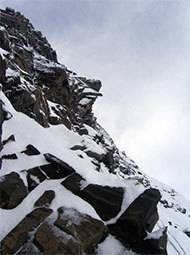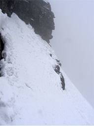 左侧的大烟囱有50米高左右的样子,看到它是不想过去尝试的,因为还要往下降十米,然后沿着烟囱的凹处到底部,接下去就是整块的直壁了,太高了,太危险了,云雾中烟囱的直壁可不是好惹的,还好右侧转过去就是一个不陡直的小烟囱,下面是云中的深渊,不停地大口呼气,大约80度的岩壁,岩石不好,无法,冰镐挂上就发力,然后不停地放保护点,所有得机械塞都在这里用了,再翻上雪壁的一瞬,安全了,山顶在云里面呢,雪有点硬了,感谢大风啊,石头上的岩缝也多,赶紧设好保护站,挂在上面喘气,才一半的绳子左右。 最后两个绳距是比较好的雪坡,顶峰风雪交加,看不清,很快就开始下撤,时间不多了,天很快就要黑了。(左图:烟囱下的陡壁)