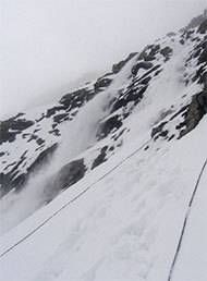 昨晚另外两条绳子由于卡在了石头上没有取下来,所以我们就利用50米备用绳结组攀登,100米的绳距后找到了上面的绳尾,4个小时后总算都到了昨晚上方岩石的固定保护站处,短短的170米的绳距,费时4小时,而且上去后几乎都不说话了,接下来决定左侧斜切下降,这一段斜切很危险,60米的绳距,双绳下降,面临的危险就是钟摆效应。接下去4个60米的垂降后到达一个雪壁上,最后的岩石段抽绳时又碰到了绳子卡住的问题,好不容易取下来,雪壁的雪很松,不过已经能够远远的看到1号营地的位置,心里面不仅松弛下来了,小心的下了雪壁,接下去整个雪壁路线的松雪走三步滑倒一步,雪深没膝盖。