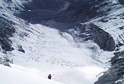 6:30出发,原以为1个半小时就可以到达西壁悬冰川下面,哪料到这段路相当长,9:00才上到冰川,上面有大堆大堆的冰崩堆积物。绕过了几个巨大的冰裂缝,终于来到了悬冰川下。